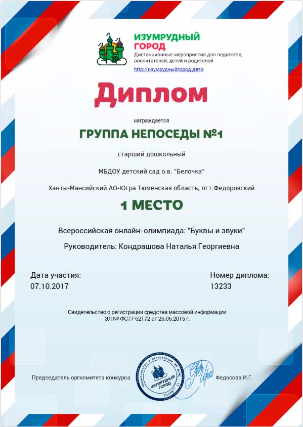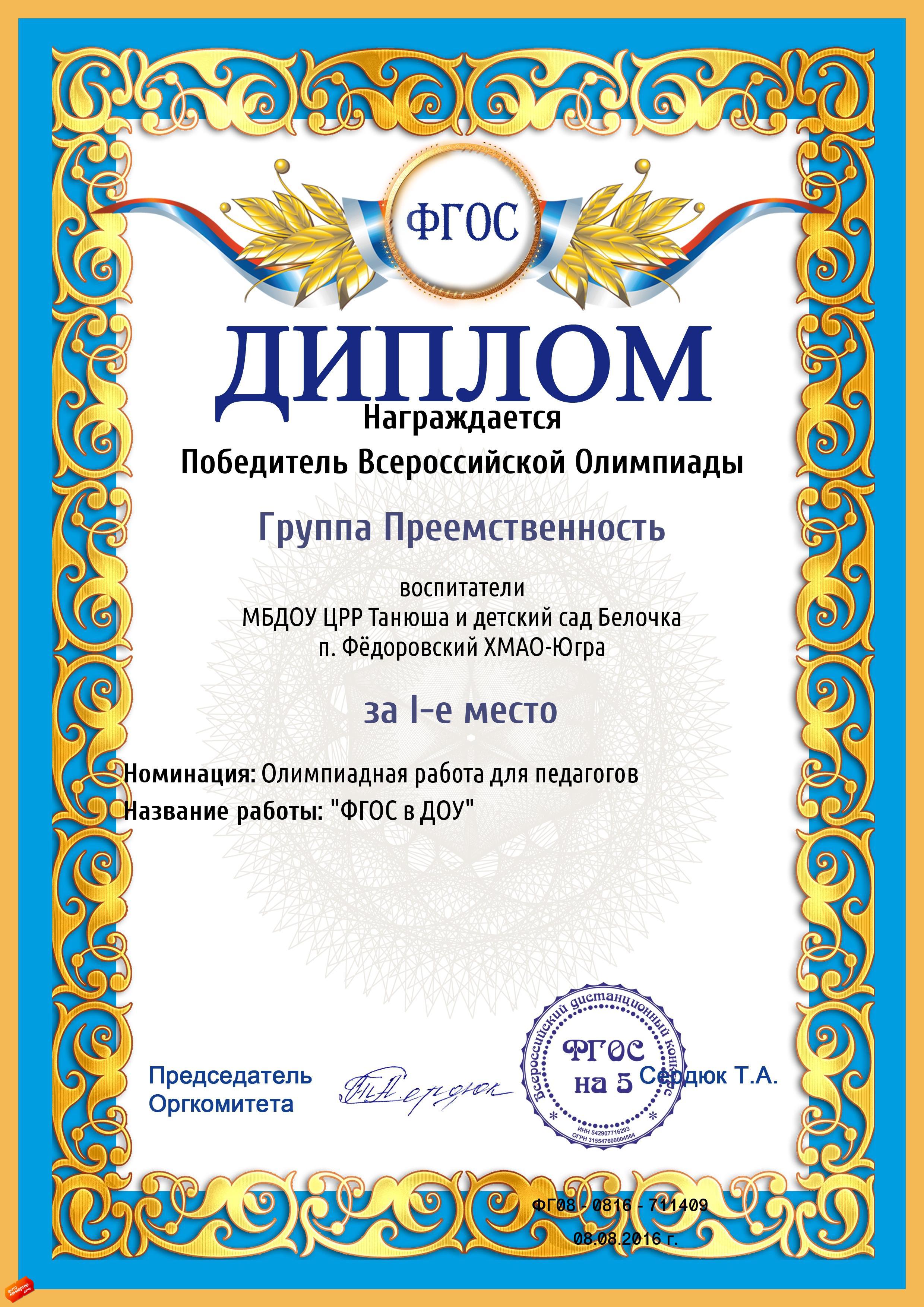 Диплом , I место, Всероссийской Олимпиады, "Олимпиадная работа для педагогов" "ФГОС в ДОУ"