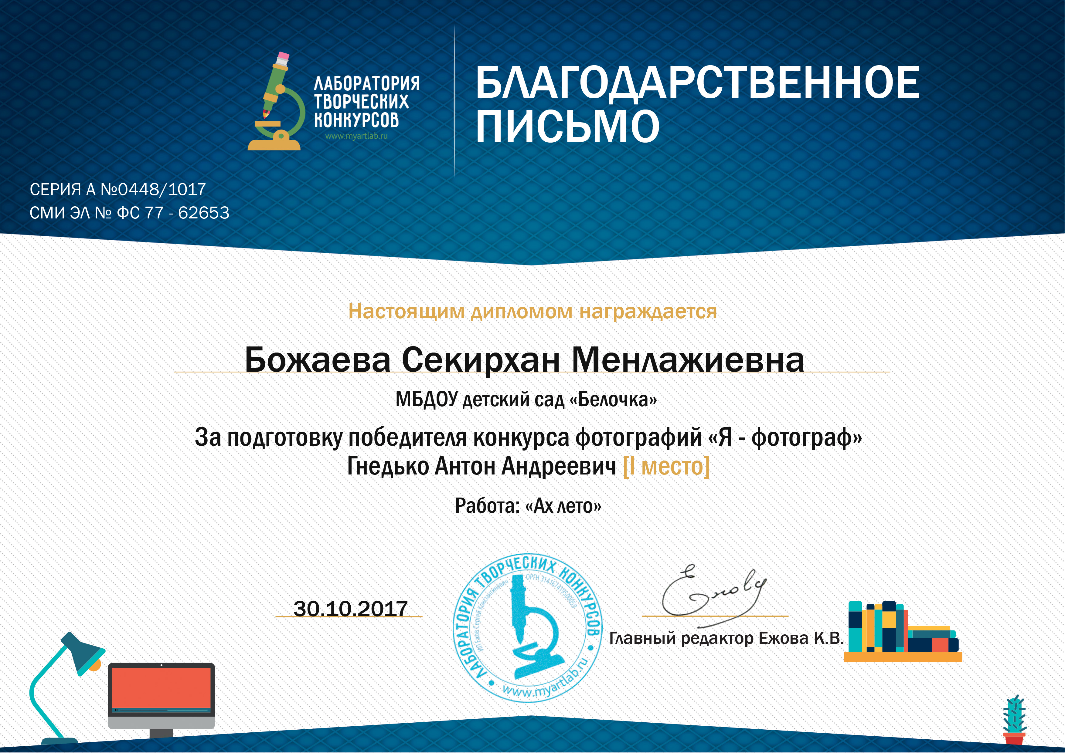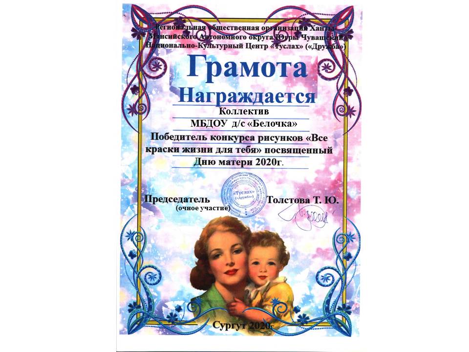 благодарственное письмо за подготовку победителя во Всероссийском конкурсе "Страна талантов" изотворчество - "Портрет мамочки родной"