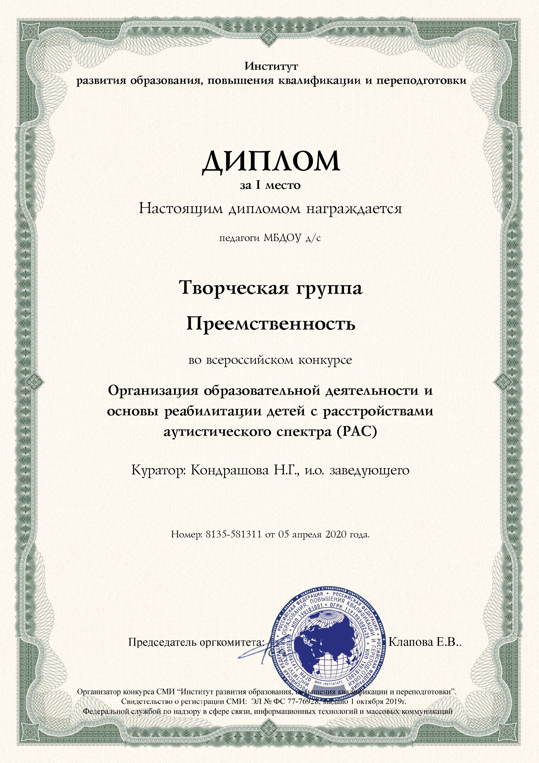 Диплом I место, всероссийский конкурс "Организация образовательной деятельности и основы реабилитации детей с расстройствами аутистического спектра (РАС)