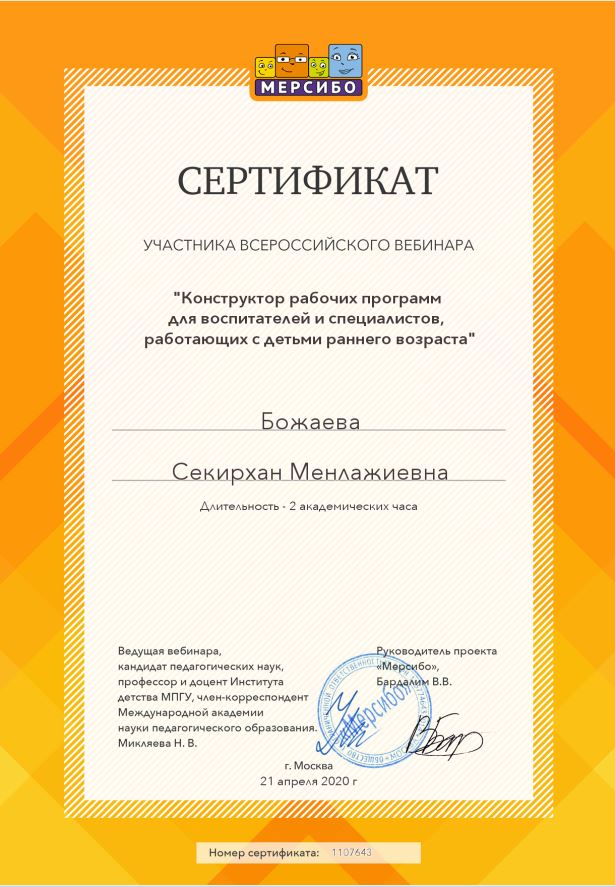 вебинар "Конструктор рабочих программ для воспитателя и специалистов работающих с детьми раннего возраста" 2020г.